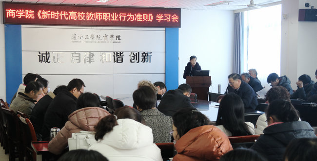 3月6日下午,商学院组织全体教职工专题学习《新时代高校教师职业行为十项准则》。会议由学院党委书记杨天华主持。