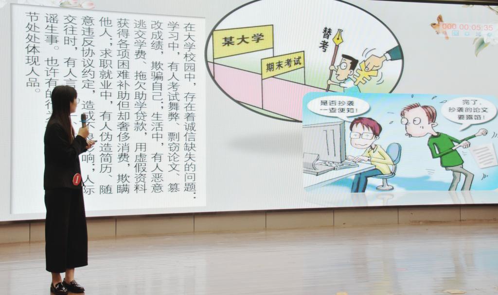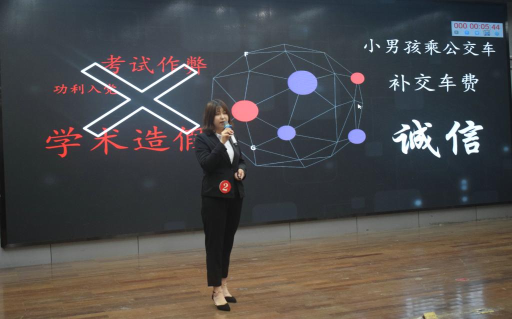 通过初赛的激烈角逐,共八名选手进入决赛。赛前,主持人详细讲解了比赛环节设置及评分规则,随后选手们紧紧围绕本次活动主题,以人格力量为切入点,并结合自身的学习经历与生活体会,向大家阐述了自己对诚信的理解。演讲中,选手们结合实例,列举诚信事例,追根溯源、引经据典,向同学们弘扬“诚信为本”正能量,呼吁大家坚守诚信,做合格的社会主义建设者。在问答环节,参赛选手们从容应对,对答如流,充分展示了我校诚信教育的良好效果。最后一环节中选手分为两组,分别演出了“大学生助学金名额评选”和“出租车司机私吞乘客钱包”这两个情景剧,展现了“诚信,为人之本”的深刻内涵。选手们的精彩表现,赢得现场掌声不断,同学们也从这些短剧中深刻认识到诚信的重要性。
