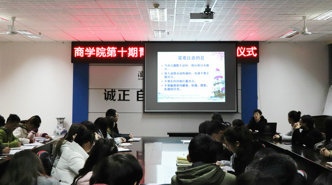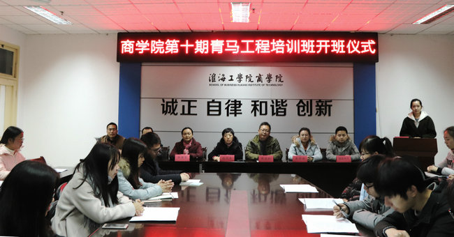 2017年11月29日,商学院第十期青马工程培训班开班仪式在苍梧校区主楼606举行,出席本次开班仪式的领导有商学院党委书记杨天华、商学院党委副书记张振松、商学院学工办主任徐建芬以及商学院各专业辅导员,各个学生组织代表、各班团支书及第十期青马班学员参与了本次开班仪式。