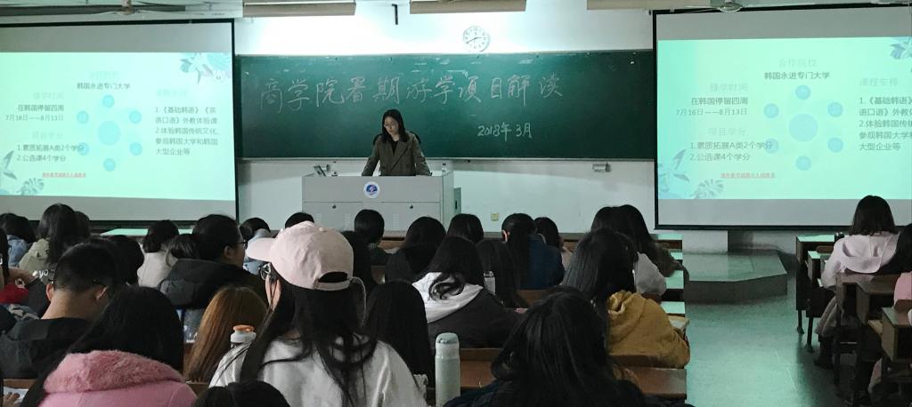 国际交流与合作处赵龙莎老师介绍了我校近年来开展海外修学情况以及学校新试行的奖学金鼓励政策,并对2018年暑期开展的韩国、日本、澳大利亚、英国及美国等海外修学项目做了详细解读,同学们对各个项目的行程、课程和费用都有了进一步的了解。