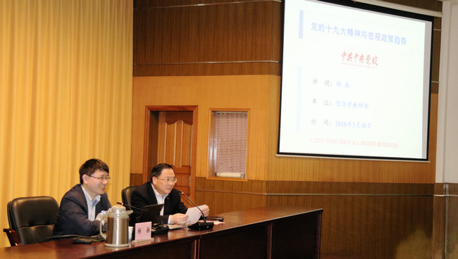 下午,中央党校经济学教研室副主任杨振为全体学员作了题为“党的十九大精神与宏观政策趋势”的报告,杨主任分别从十九大报告的历史贡献、经济发展新常态大势、供给侧结构性改革、如何适应宏观政策变革等方面,用生动的事例和详实的数据,结合自身的工作生活实际,对党的十九大精神与宏观政策趋势进行了系统全面、准确精彩的解读。商学院部分师生旁听了杨主任报告。