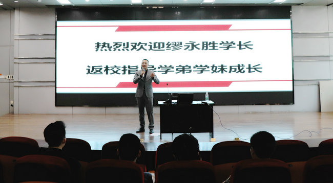 缪永胜现任山东萃能石化有限公司总经理、淄博萃能石化有限公司总经理、大连天健石化有限公司总经理。报告会上,他从自己在校时兼职体验社会的肯吃苦谈到初入职场的踏实勤奋,从自己事业的低谷讲到人生中的转折机遇,言辞恳切地向在座的学弟学妹传授人生感悟和自己20年的职场经验。并与大家共享自己多年总结出的人生4个金句:1、厚德载物;2、“我”是一切的根源;3、人生最宝贵的财富是别人的欣赏与信任;4、一个人的商业价值在于解决问题的能力。