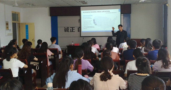 近日,商学院在主楼606举办了“美国加州大学河滨分校‘3+1+1’商科硕士项目”宣讲会。院党委副书记、副院长王智金,国际交流处陈倩、赵龙莎,辅导员程雪出席宣讲会。2016级和2017级河滨分校试点班的同学参会。加州大学河滨分校商学院安德森管理学院副院长国际关系负责人陈少辉主讲,介绍了河滨分校项目的具体内容和项目优势。