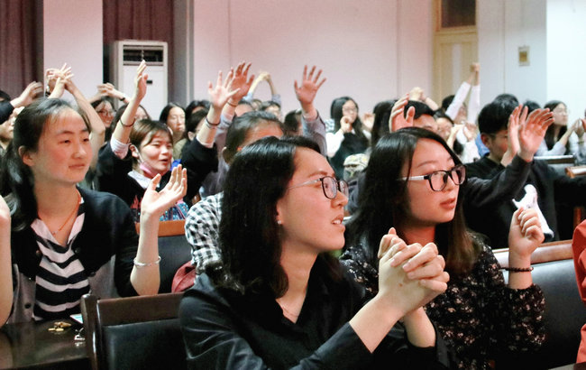 最后,现于中投证券连云港分公司任投资经理一职的一六届毕业生傅大斌以一个小游戏开场,介绍了学习的重要性,鼓励同学们多读书,用读书来丰富自己的内涵,提升自己的价值,强调“读书,是人生最廉价的投资”。