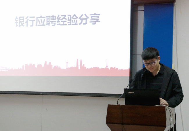 接着,金融141班的胡涛学长着重介绍了为什么要在大学报考公务员的原因,同时提出在选择公务员岗位时要注意选择竞争力小的岗位,以便更容易获得成功。