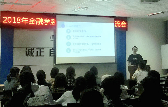 主持人贺磊首先依次介绍了会场嘉宾,并对今年金融系考研考公考银行情况进行阐述,送上贺词。进而依次邀请成功考上华东师范大学教育经济与管理专业硕士的金融142班吴丹学姐、成功被苏州大学金融专业硕士录取的金融141班徐思敬学长及成功考上浙江工商大学金融硕士的金融142班刘嘉未学姐介绍他们的考研之路。考研代表们就各科考研资料的选取、复习计划的制定、考研院校的选择等方面向学弟学妹们分享了自己的学习经历与考研经验。同时针对考研中遇到的特殊问题,如考研复习时间分配问题、考研过程中遇到的情绪失控问题、考研后专业调剂问题等作出相应的解答。