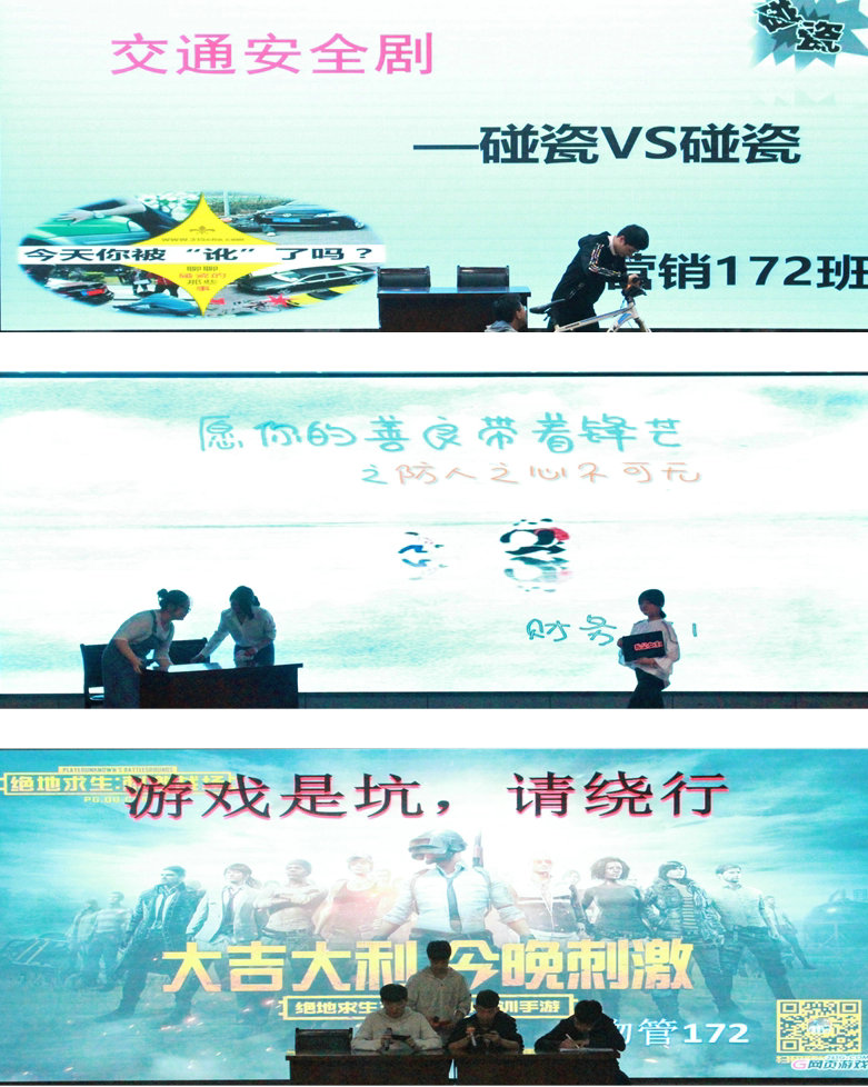 大赛开始,首先金融172班带来的话剧作品《镀金时代》,以精湛的演技与独到的视角,深层次地剖析了校园诈骗的手段与心理,呼吁同学们提高防骗意识,远离校园诈骗;随后会计172班带来的作品《小幸运》,其丰富的故事情节与惟妙惟肖的表演,生动地揭露了建立在物质利益上的虚假情谊,同时颂扬同学情的纯真与永恒,立意深远,深深感染了在场观众;物管172班带来的作品《游戏是坑,请绕行》则更加贴近校园生活,以风靡校园的手机游戏为主题,生动形象地展现了主人公从痴迷游戏到幡然醒悟的心路历程,指出游戏误时误事,教导同学们要适度,才能享受生活。紧接着,营销172班展示的交通安全剧“碰瓷VS碰瓷”,以精彩的情节展示了碰瓷带来的恶劣影响,警醒同学们要强化自我保护意识,学会用法律武器保护自己的财产人身安全,其幽默诙谐的表演方式与地方方言相结合,赢得在场观众的一致掌声;而营销171班的作品《自己》,则通过由科幻机器人来代为学习讲述了主人公由迷茫到成熟的心理成长历程。最后,财务171班带来的作品《愿你的善良带着锋芒》,以主角在遇到别人需要帮助时内在感性与理性的帮与不帮的争吵推动剧情发展,新颖的故事情节紧紧抓住了观众目光,强调了人身安全的重要性以及遇到问题时要学会理性思考。整个大赛表演期间还穿插了趣味横生的观众互动环节,通过三个话剧知识的问题抢答,提高了观众的参与度,活跃了现场气氛。