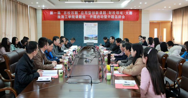 2017年3月26日下午2时30分,第一届“百校百题”应用型创新课题(财税领域)大赛淮海工学院课题组开题启动暨答辩会在淮海工学院文渊楼会议室隆重举行。本次会议邀请了淮海工学院党委副书记、副校长宁晓明,校发展规划处处长乔斌,市财政局会计处处长张军,市国税局所得税处处长仲维生,连云港海通物流有限公司董事长张国兴、财务部长朱孟文,江苏新海发电有限公司财务总监顾中林、财务副总吴茂富,淮海工学院商学院党委书记杨天华、院长宣昌勇、副院长张瑞龙、会计、财务系主任及副主任、指导老师以及课题组学生参加了会议。