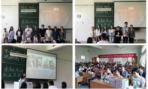 李鑫、范鑫珠、彭威、刘奔等4名同学作为考研代表从考研院校的选取、复习材料的选取、复习计划的制定、学科复习的窍门等方面为学弟学妹们作了详细介绍。程茜作为出国深造代表为大家介绍了另一种考研的道路(出国深造),也让许多不熟悉出国发展的同学多了几分了解。李培蓓、汤君艳、陈方远同学给学弟学妹们提供了银行就业准备、复习和面试等方面的很多技巧。张道清同学为同学们详尽阐述了备考公务员的注意事项。