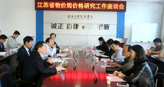 2017年5月10日上午,江苏省物价局价格研究工作座谈会在商学院会议室举行,副校长舒小平教授出席了座谈会。省物价局价格研究所所长华文、副所长顾瑾,市物价局副局长丁元奎、副调研员杨佃春等省市物价局的领导,万联能源集团监事会主席刘玉来,四季农产品市场办公室主任徐渊,商学院院长宣昌勇以及参与课题研究的部分老师参加了座谈会。