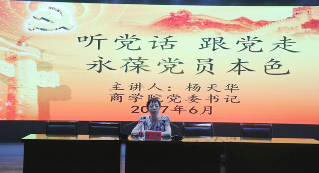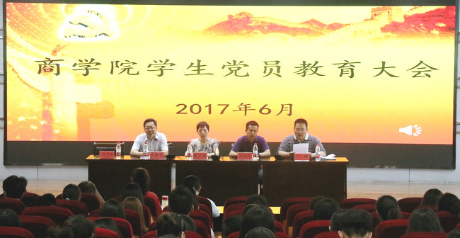 2017年6月19日下午,商学院学生党员教育大会在艺术楼报告厅召开。大会由商学院党委副书记张振松主持,校纪委办公室副主任、监察处副处长马志同,商学院党委书记杨天华,商学院党政办公室主任兰巍,商学院全体学生党支部书记出席会议。