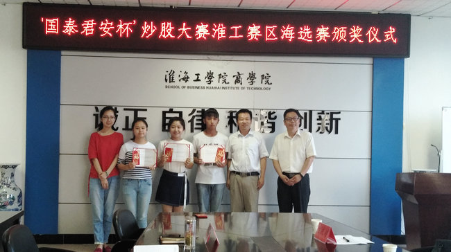 2017年6月23日下午4点,由商学院承办的“国泰君安杯”炒股大赛淮工赛区海选赛颁奖仪式于苍梧校区主楼606圆满举办。会议由张振松书记主持,国泰君安江苏分公司连云港营业部总经理庄庆超、商学院党委副书记张振松、商学院辅导员程雪出席颁奖仪式,仪式由张振松副书记主持。海选赛获奖选手、金融协会以及国贸协会等30余位成员参加了颁奖仪式。