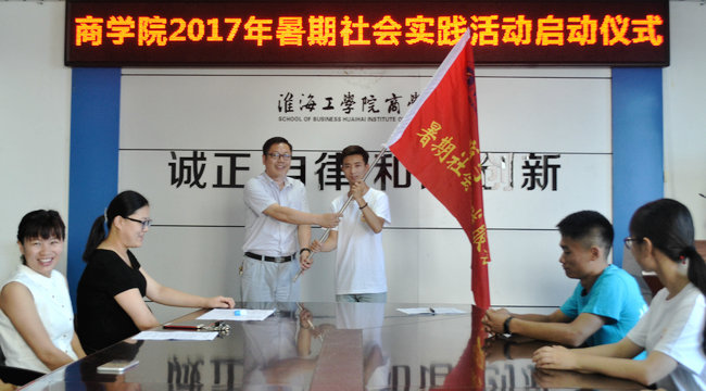 2017年7月4日上午,商学院2017年大学生暑期社会实践出征仪式在苍梧校区主楼606会议室举行。出席本次仪式的有商学院党委副书记张振松、学工办主任徐建芬、商学院团委副书记李淑华、辅导员娄婷婷、叶舟、程雪及商学院七支暑期社会实践团队成员。本次仪式由李淑华老师主持。