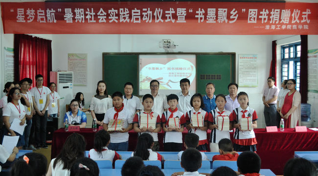 7月6日上午9时,淮海工学院商学院“星梦启航”暑期社会实践启动仪式暨“书墨飘乡”图书捐赠仪式在连云港市连云区云山小学圆满举行。出席此次仪式的有连云区云山街道办事处主任张庆春及副主任马兆国、连云港市图书馆副馆长江震及社工部副主任郝涛洁、连云区四叶草助残服务中心会长罗仁娟、连云区社会工作师协会会长郭晓超、云山小学校长李佃军、副校长张雷鸣及教学主任谢琴、淮海工学院商学院党委副书记张振松及团委副书记李淑华。淮海工学院商学院“星梦启航”大学生暑期社会实践志愿服务团队、云山小学学生以及学生家长参与了此次仪式,启动仪式由大学生志愿者秦昆主持。