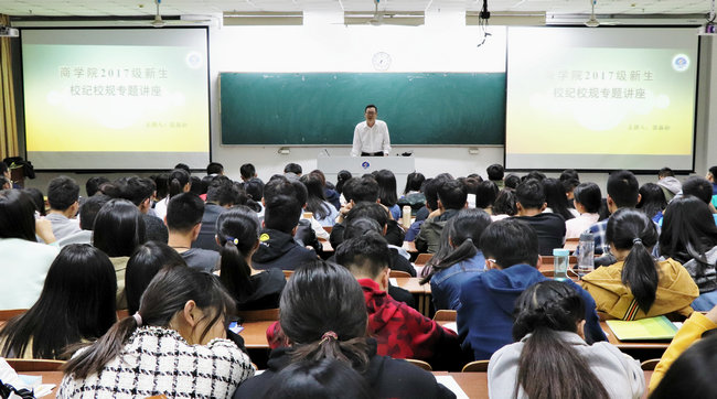 十月十一日晚,商学院党委副书记张振松于通灌校区至善楼105和至善楼205举办了商学院2017级新生入学教育系列之校纪校规专题讲座,就“遵守校纪校规,提升个人素质”这个主题同商院学子进行深入交流。