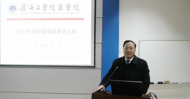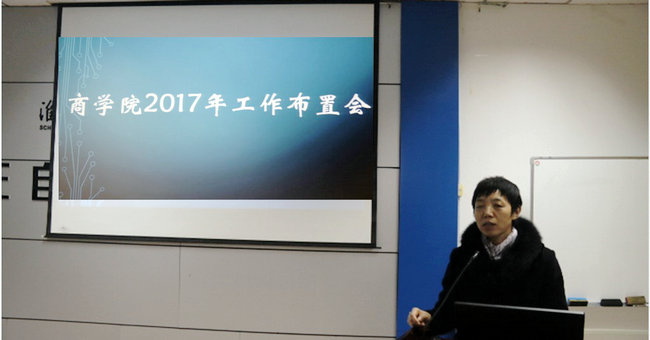 在召开的全体教职工大会上,杨天华书记首先传达了学校“大学创建年”动员大会精神,要求全体教职工认真学习校党委书记赵炳起在动员大会上的讲话——《认清形势坚定信心抓住关键振奋精神为加快推进江苏海洋大学创建而努力奋斗》。接着,宣昌勇院长将商学院2017年党政重点工作作了全面部署和工作动员,他强调,全面推进创建江苏海洋大学是当前学校的中心工作,商学院作为四大平台的重要环节,决不能脱节吊链,全院上下团结一致,勇挑重担,努力完成学校交付的各项工作任务。