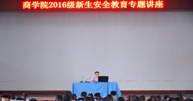 2016年6月21日下午2点30分,商学院2016级新生入学教育之安全教育专题讲座在通灌校区前程餐厅举行。本次安全教育专题讲座主要涉及两个版块内容:防诈骗版块和女生健康知识版块,商学院党委副书记、副院长张振松和辅导员老师李淑华分别主讲,为新生展开了一系列全面详实、案例丰富的安全教育内容。