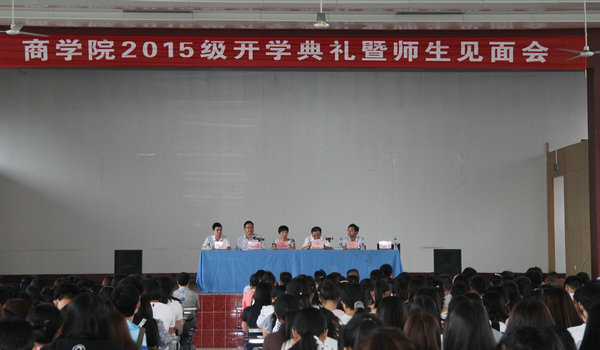 2015年9月6日下午,商学院2015级新生开学典礼暨师生见面会在通灌校区前程餐厅隆重举行。商学院党政领导、系主任、党支部书记、各专业辅导员、新生班主任以及六百余名2015级新生参加了大会,会议由商学院党委副书记张振松主持。