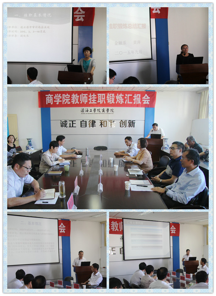 2015年9月16日下午,商学院举行教师挂职锻炼汇报会。完成挂职锻炼任务的4位老师:武玉清、商思争、张纪凤和黄萍分别向商学院全体教职工汇报了他们挂职锻炼的情况。4位老师挂职单位的领导:市审计局企业处田虹处长、农环处副杨兴兵副处长、润天进出口贸易有限公司潘如龙总经理和南京证券苏北分公司闻长兵总经理四位嘉宾出席了会议,并分别对4位老师挂职期间的表现和所取得的成绩进行了点评。