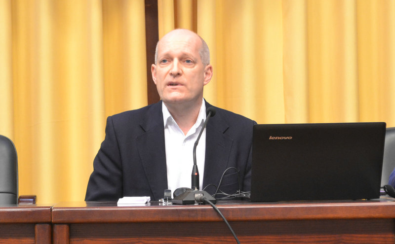 Simon教授开头用汉语做了自我介绍,接下来就中国与英国经济交流中的金融合作、英国积极参与亚投行的原因、中英共同面临的问题发展方式的转变及中英核能源合作等问题进行了阐述。