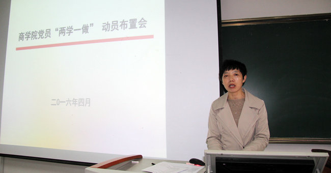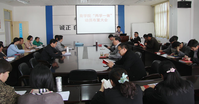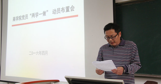 4月13日、20日下午,商学院在主楼606室和主楼202室分别召开教工党员、学生党员“两学一做”学习教育动员布置会,党委副书记张振松主持会议并带领全体党员学习了校党委《关于在全体党员中开展“学党章党规,学系列讲话,做合格党员”学习教育方案》,学院党委书记杨天华作动员报告,并对各支部开展“两学一做”活动进行部署,学院全体党员出席会议。