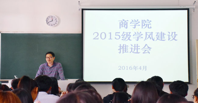 在学风建设推进大会上,张书记首先阐述了学风建设的重要性,他强调学风是一个学校的根本,是学生成才的前提保证。他从专业思想、课堂纪律、文明举止等方面就学院当前学风建设的现状和存在不足进行了分析,强调商学院学风建设目前已经取得了阶段性的成果,学院学风良好,学生在校规校纪方面进步很大,但是仍然要正视学院学风建设存在的问题,查漏补缺。随后各班级学生干部代表就本班级学生在学校开展学风建设活动以来在学习和生活上发生的改变及仍然出现的问题进行了汇报和交流,如晚自习考勤、选修课点名、上课考勤、学生挂科留级等,出席会议的老师分别对学生的疑问进行了耐心地讲解,对班级反映的学风建设中仍然存在的问题做了详细的了解和记录。