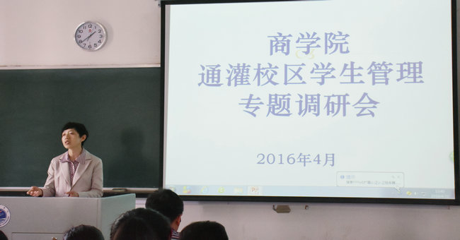 为营造积极向上的学习氛围,切实做好学风建设工作,加强通灌校区学生管理,商学院于4月22日在通灌校区明德楼118分别召开了“商学院2015级学风建设推进会”、“商学院通灌校区学生管理专题调研会”。商学院党委书记杨天华、党委副书记张振松以及各专业辅导员出席了本次会议。商学院15级各班班长、团支书和学习委员参加了此次大会。