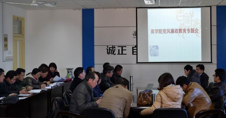 3月13日下午,商学院开展了党风廉政专题教育活动。学院领导班子成员、系主任、实验室主任、党支部书记、辅导员和管理人员参加了会议,院长吴价宝主持会议。