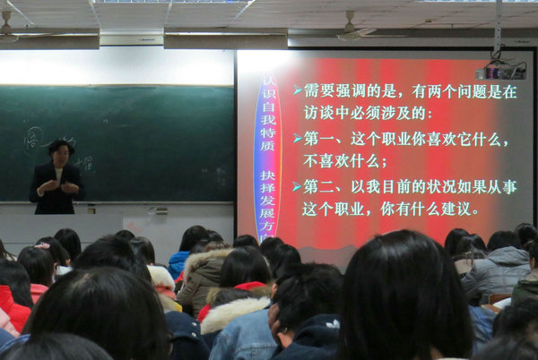 姚铁明教授在讲座开头提出:听讲座最重要的是做到知行合一,希望同学们有所收获。姚教授首先给大家明确认识自我的复杂性和重要性,她告诫同学们在当今社会只有个人特质与所限定的条件相协调一致才能取得最理想的成绩。接着,姚教授提出成功从选定目标开始,并以马拉松为例为同学们提供了实现目标的技巧——分阶段实现大目标来激励同学们心中要树立明确的方向。姚教授还劝诫同学们成功殿堂的大门不是任意通行的,走上成功巅峰要从自我认知、进行人生规划并坚持不懈地奋斗。她为同学们提供了一些自我认知的方法,例如找到个人成就事业、生涯人物访谈等,姚教授声情并茂的演讲赢得观众阵阵掌声。之后,姚教授点明当今社会需要的是复合型人才,认为培养思考的悟性是培养复合型人才必备品质。最后,姚教授强调人生定位恰当是关键,并向大家送出了祝福:“成功目标丰硕,你所关注的,就是你的未来”。