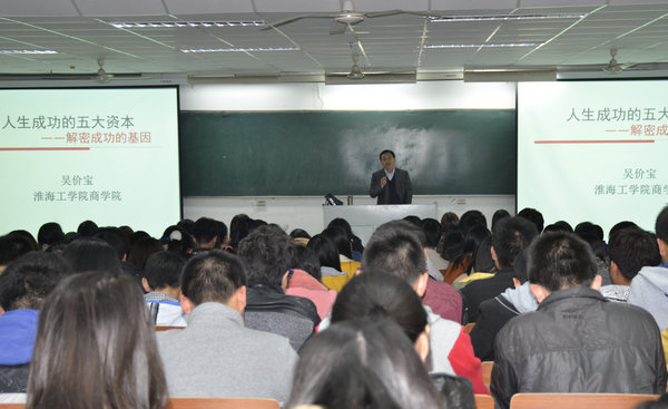 2014年11月11日晚19点,商学院新生教育“人生成功的五大资本—解密成功的基因”专题讲座在通灌校区TZ310教室成功举行。商学院院长吴价宝教授担任本次讲座的主讲人,商学院党委副书记马建新担任主持,大一新生和辅导员参加了本次讲座。