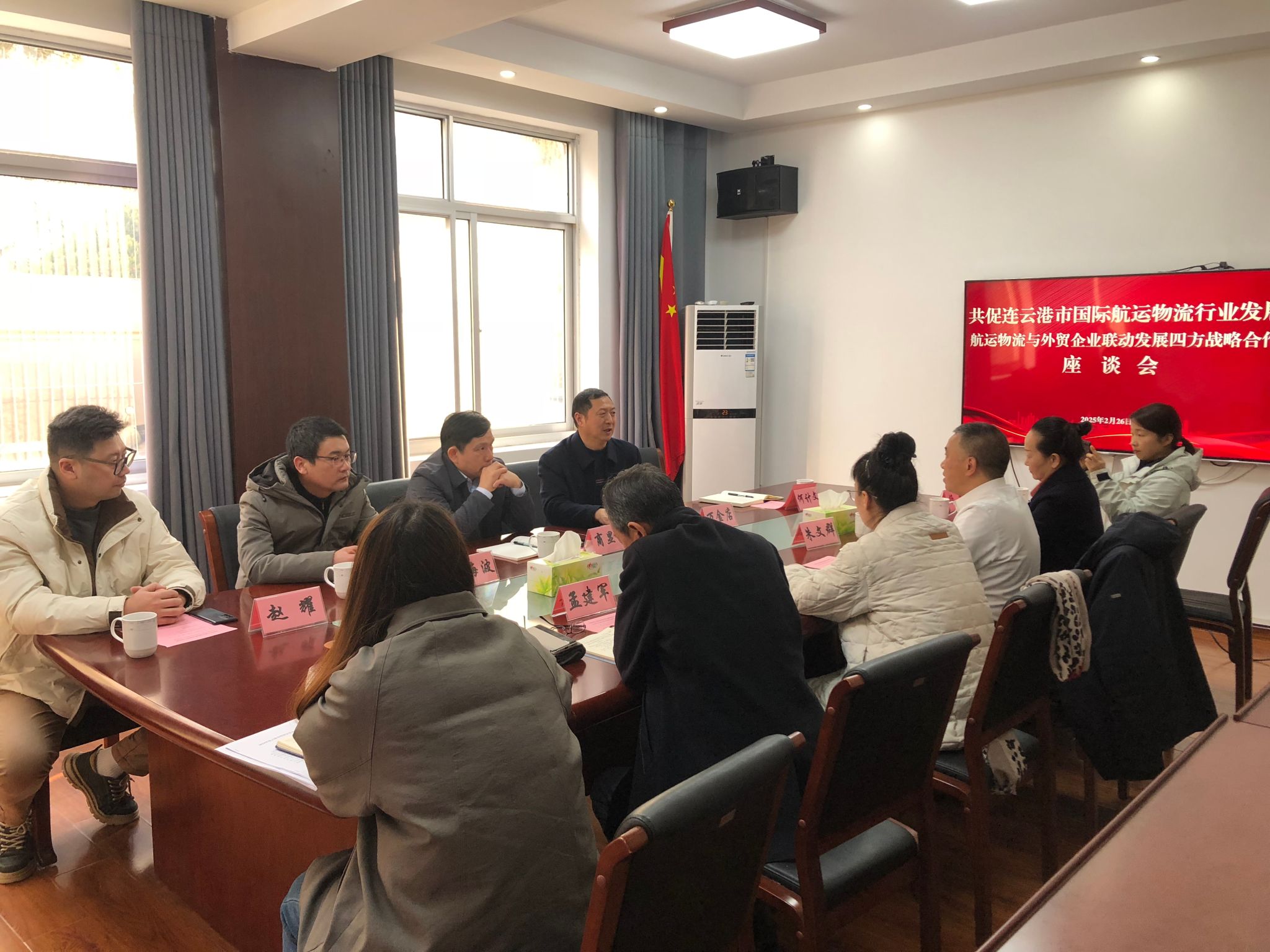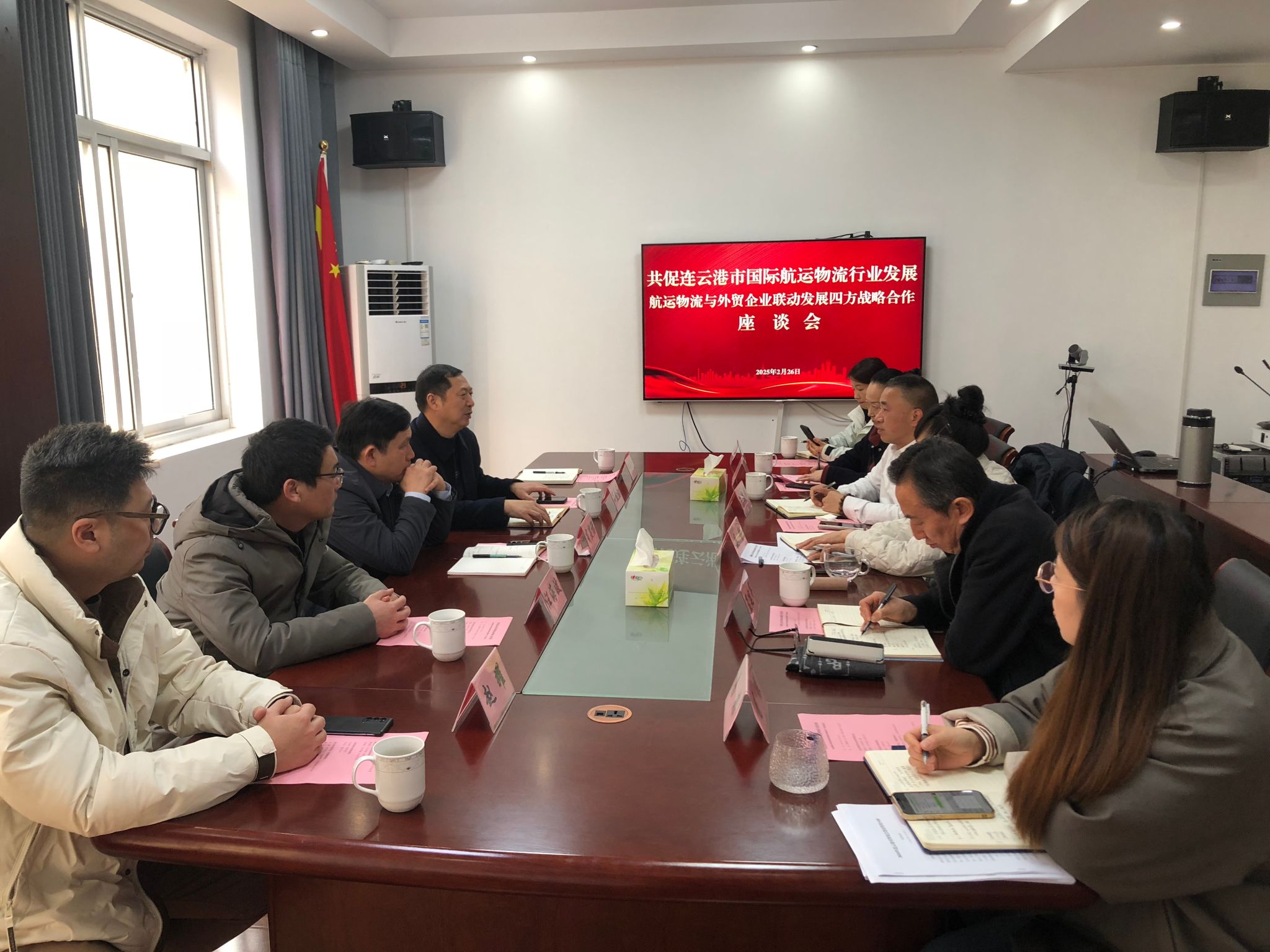 2025年2月26日,江苏海洋大学商学院、连云港市哲学社会科学界联合会、连云港市贸促会、连云港市国际航运物流协会四方齐聚连云港市贸促会会议室,举行党建联建座谈会。此次座谈会旨在通过党建引领,凝聚各方力量,促进资源共享与优势互补,共同探索党建与物流行业融合发展新路径。