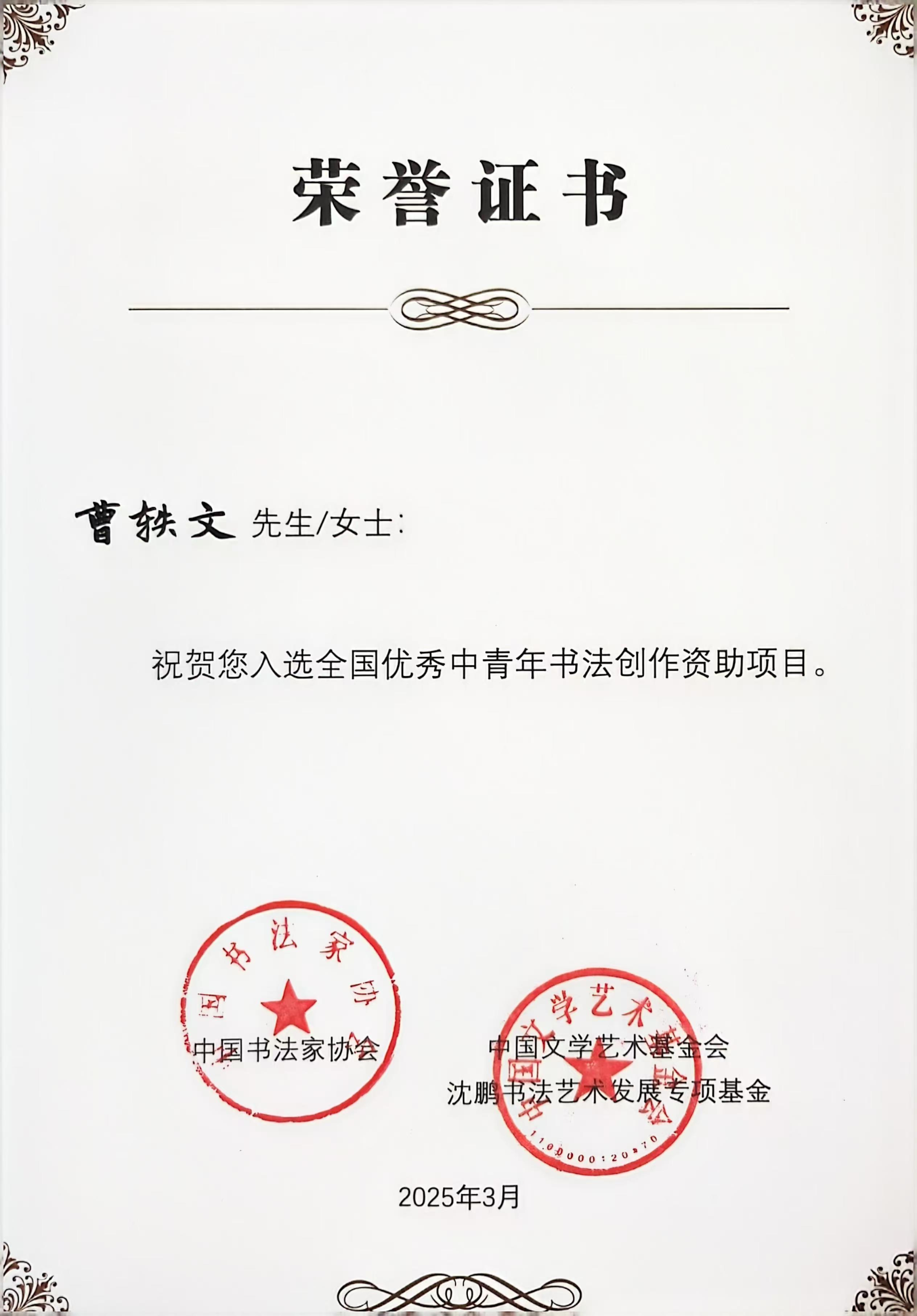 3月23日,中国文学艺术基金会沈鹏书法艺术发展专项基金发放仪式暨“守正创新 笔耕时代”青年书家创作座谈会在中国文艺家之家举办。全国首期资助名单45人,江苏海洋大学商学院曹轶文获资助,江苏省共7人受资助。