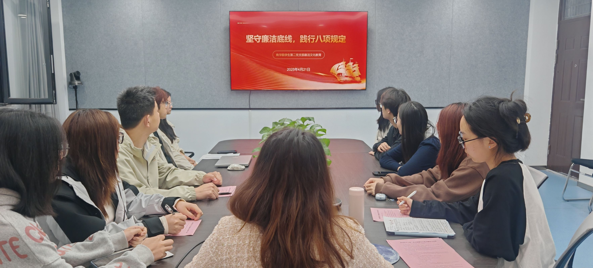 党委副书记王智金、学生第一党支部书记杨舒翔、学生第三党支部书记孙佳荀及学生党员代表一行,走进连云港海军驻连某部参加“军营开放日”活动,深刻体会到海军官兵的忠诚与担当,也增强了大家的爱国情怀和海洋意识,是一堂生动的国防教育课。学生第二党支部按计划开展廉洁文化教育,支部书记谭鑫主讲党课《坚守廉洁底线,践行八项规定精神》,通过观看李大钊的廉洁故事、学习典型案例的警示与启示,深入理解廉洁文化的内涵,学生党员杨鑫就“作为一名学生党员,如何在同学中传播廉洁文化”做重点发言,大家纷纷表示会将学习成果转化为行动自觉,做到知敬畏、存戒惧、守底线。
