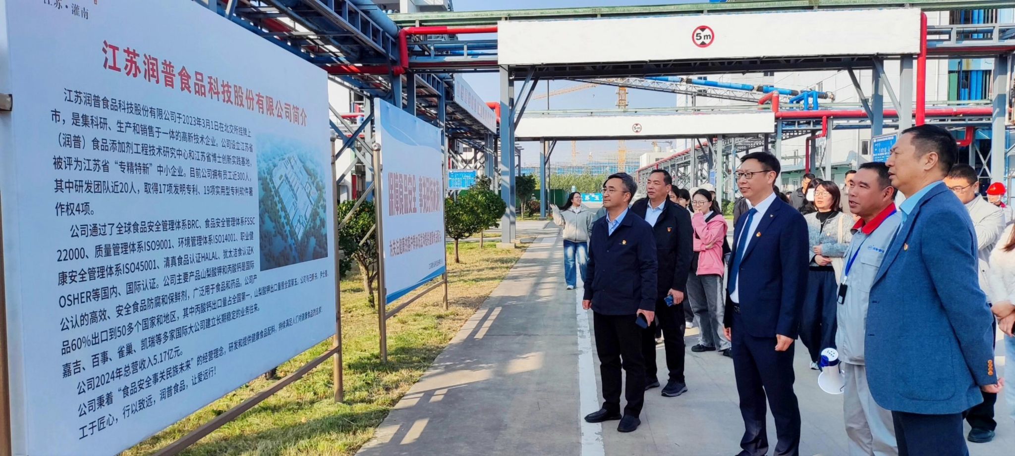 一行人首先前往公司的灌南生产基地参观学习。公司副总经理何磊带领大家走访实验室、生产线及仓储物流系统,详细介绍山梨酸钾、丙酸钙等食品添加剂的技术发展与应用场景。参与人员认真聆听讲解,不时驻足查看、交流询问,深入了解企业生产运营状况。
