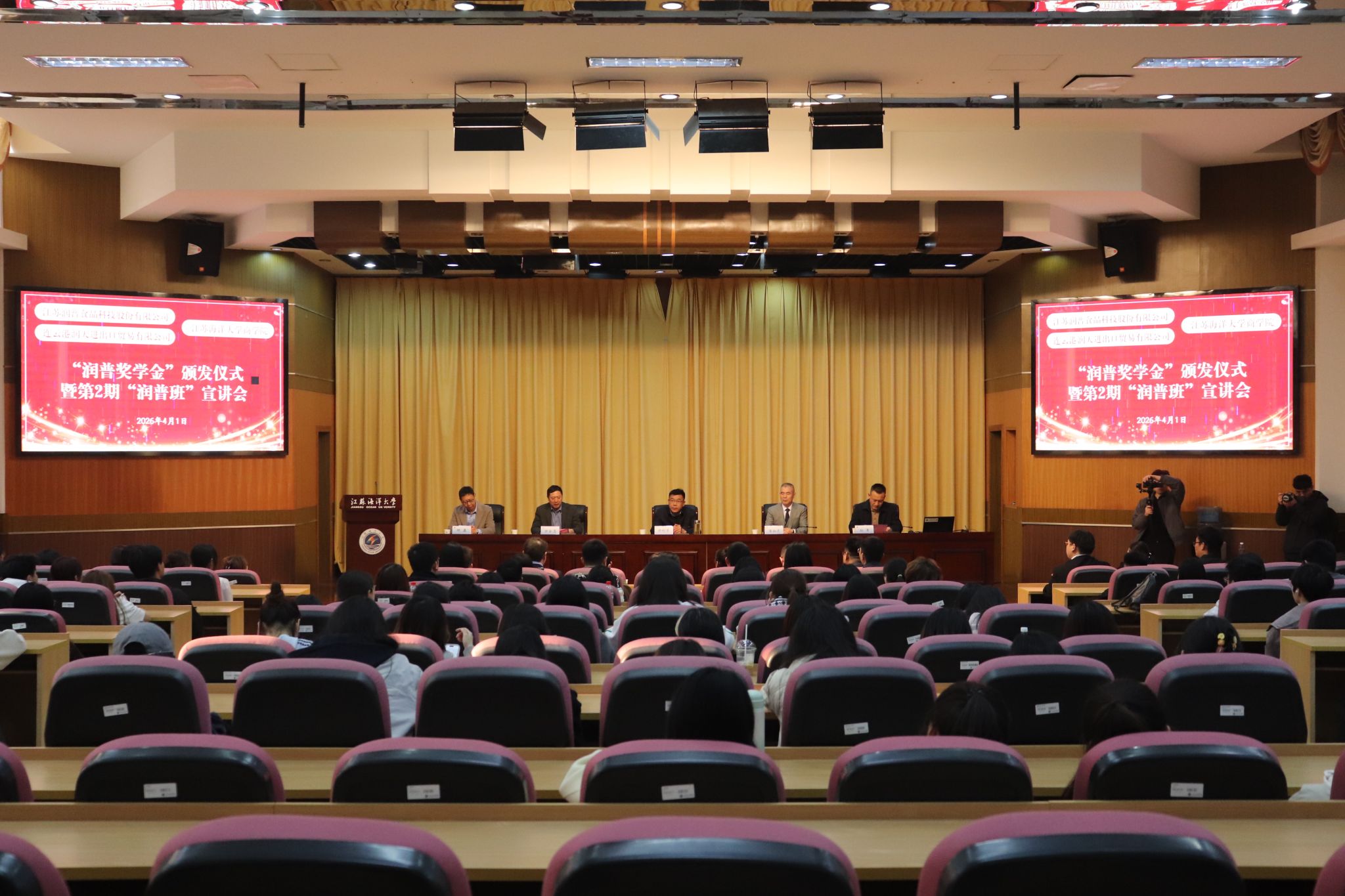 为深化产教融合、创新人才培养模式,2026年4月1日下午,江苏海洋大学商学院于文博楼讲堂举办“润普奖学金”颁发仪式暨第二期“润普班”宣讲会。江苏润普食品科技股份有限公司、连云港润天进出口贸易有限公司董事长潘如龙一行嘉宾,江苏海洋大学党委常委、副校长郑利军,商学院领导班子成员及师生代表齐聚一堂,共同见证校企合作迈向新台阶。会议由商学院党委书记万金店主持。